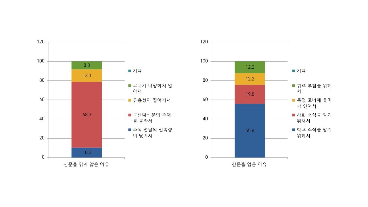 신문에 대한 설문 반응으로 ‘군산대신문을 읽어본 적 있는가’에 대한 질문에 80.5%가 ‘아니요’라고 응답했으며 그 이유로는 ‘신문사의 존재를 몰라서’가 68.3%로 가장 높은 비율을 차지했다. 반면 ‘예’라고 응답한 23.4%는 신문을 읽는 이유로 55.8%가 ‘학교 소식을 알기 위해서’라고 답했다.