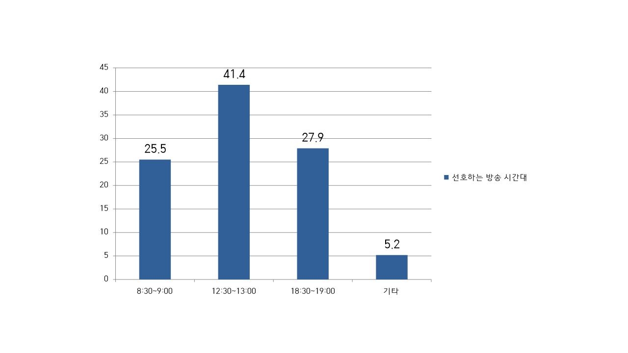 ’선호하는 방송 시간대는 어느 시간인가‘하는 질문에 12시30분~13시(41.4%)와 18시30분~17시(27.9%)가 가장 많은 비중을 차지했다.
