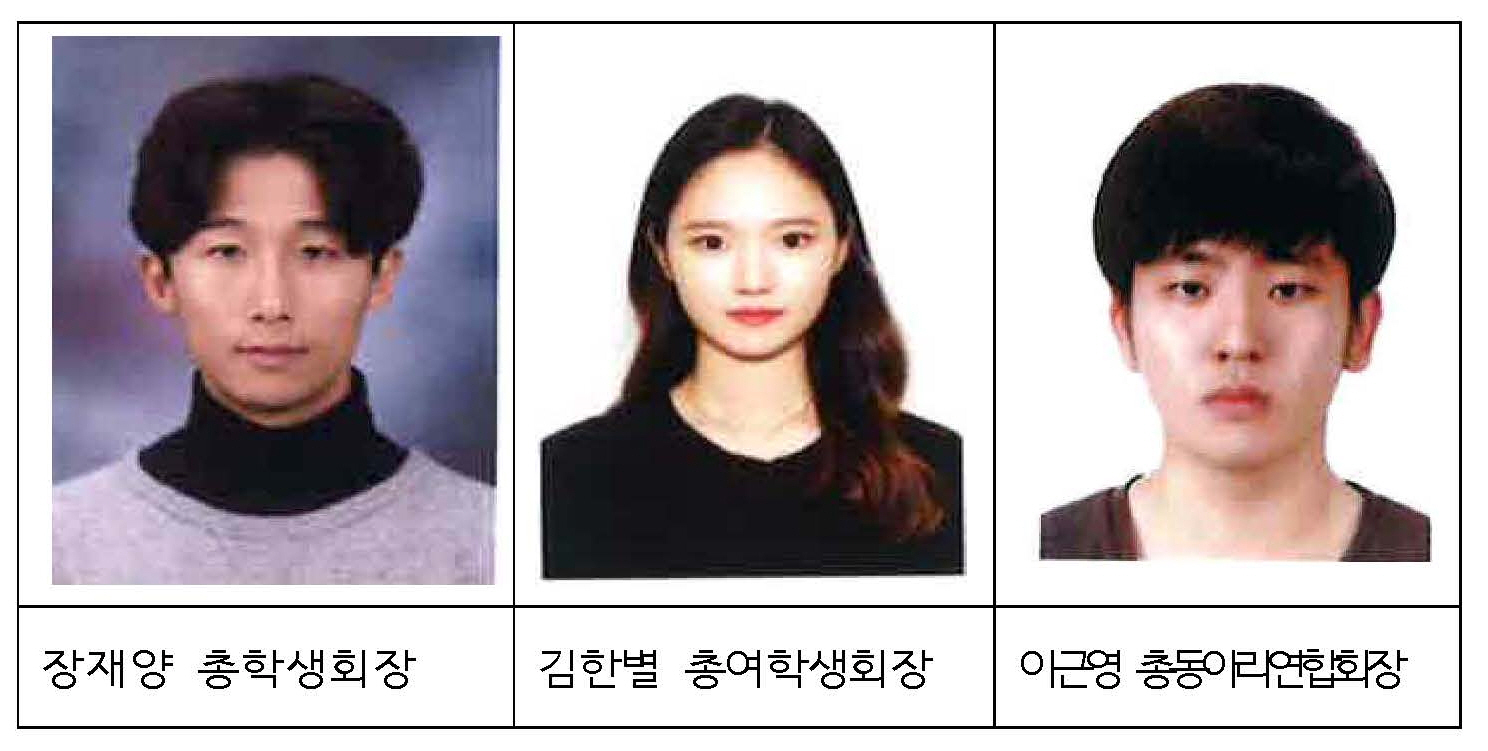 | ▲왼쪽부터 장재양 총학생회장, 김한별 총여학생회장, 이근영 총동아리연합회장 |