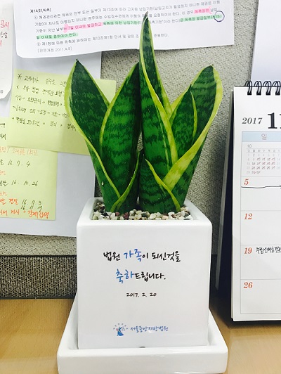 | ▲ 신규 임용이 되었을 때 받은 화분 / 제공 : 이은지 동문(법학·10) |