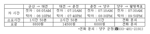양구에 가는 길도 영양 가는 길 만큼이나 만만치 않다. 군산에서 직행으로 양구에 가는 버스가 없기 때문에 동대전 시외버스 터미널에 도착 후 춘천을 거쳐 양구로 가는 시외버스를 타야 한다.