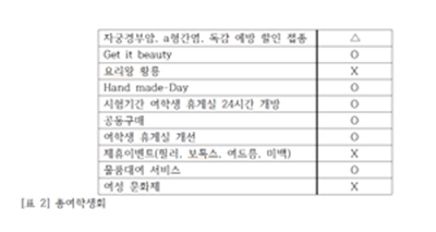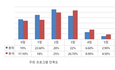 ‘Hand made-Day'가 28.4%로 가장 성과가 좋은 사업 1위를 차지했고, ’공동구매‘가 20.5%로 2위를 차지했다. 총여학생회 주최 프로그램에 대한 만족도는 현저히 낮은 수치를 기록했다. 3점 이하의 점수를 선택한 비중이 76.9%를 달했다. 한편, 20.1% 학우가 ‘제휴이벤트(필러, 보톡스, 여드름, 미백)’를 빨리 실행해 주길 원했다.