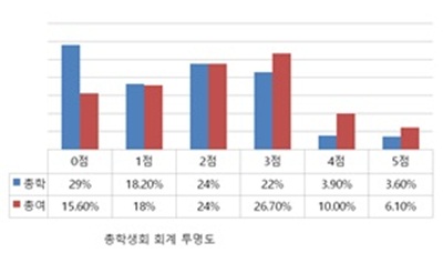 총학생회 회계 투명도에 대해 71%가 2점 이하의 점수를 매겼다.