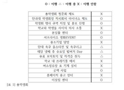 중간평가 결과 총학생회와 총여학생회의 공약 이행률은 높았다. 그러나 학우들에게 공약은 잘 알려져 있지 않았다는 모순이 있다. 또한, 공약이 잘 이행되고 있지 않다고 생각하는 의견의 비중이 컸다. 각 학생회가 주관하는 프로그램에 대한 만족도 또한 3점 이하의 점수가 70%를 넘겨 학우들의 만족도가 낮음을 알 수 있다. 의사소통의 문제 또한 2점 이하의 점수를 약 60%를 넘겨 학생과의 의사소통이 시급함을 볼 수 있다.