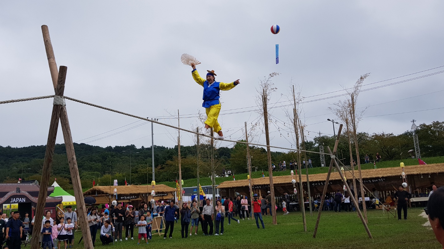 | ▲당시 재현해 놓은 저잣거리에서 곡예사가 줄타기를 하고 있다. / 사진촬영 : 이동규 기자 |