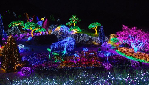 낮에 신나게 놀았다면 밤에는 화려한 빛의 낭만을 즐겨보는 것은 어떨까. ‘사랑에 빠지다’를 주제로 꾸며진 오색별빛정원전에서는 입구에서 만날 수 있는 고향집정원부터 시작하여 단풍나무와 고니가 서로의 빛을 자랑하는 분재정원, 별빛의 향연이 펼쳐지는 하경정원, 하얀 교회와 천사들이 맞아주는 달빛정원, 사랑이 피어날 것만 하는 하늘 길 등 마치 다른 세상에 온 것만 같은 다양한 이야기를 가진 정원들을 만나볼 수 있다.