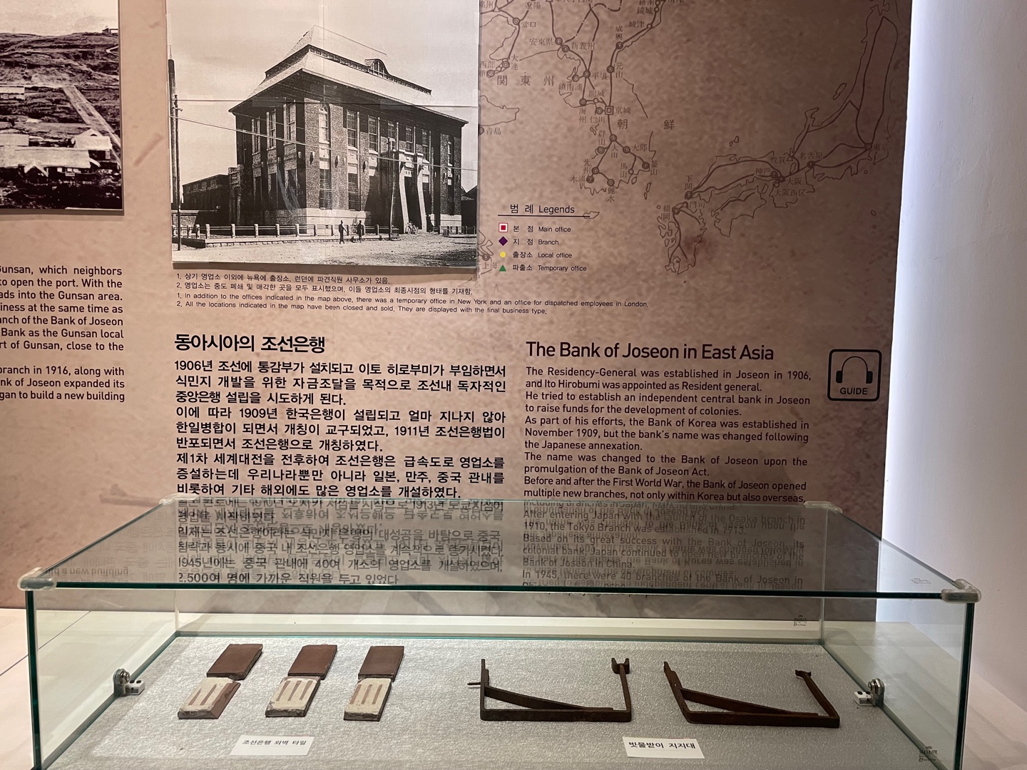 셋째로, 일제강점기 시대의 문화재로 소개할 것은 ▲‘이영춘 가옥’이다. 일제강점기 시절, 전북지역에서 대규모 농장을 경영한 일본인 대지주 구마모토 리헤이는 개정동에 한식, 양식, 일식의 복합 건축양식인 별장주택을 지었다. 이 건축물의 외부형태는 유럽의 주거형식을, 평면 구조는 일식의 중복도형 평면을, 내부에는 양식의 응접실과 한식 온돌방이 결합되어 있다. 해방 후에는 주인을 잃은 이 주택에 농촌보건위생의 선구자 역할을 해낸 ‘한국의 슈바이처’, 쌍천 이영춘 박사가 거주하게 되면서 ‘이영춘 가옥’이라는 이름으로 불리게 되었다. 이영춘 박사는 병원, 학교, 영아원 등의 각종 의료사회복지시설을 설립했을 뿐만 아니라 국내 최초로 양호실을 개설하고, 농민 의료보험을 도입한 인물이다. 그는 일식의 다다미방을 온돌방으로 개조한 것 외 외관의 구조를 포함한 전체적인 주거의 틀을 유지하였다. 현재 이 건물은 근대의 건축물로서 △당대 주거문화의 이입과 양상 △절충적인 매력이 돋보이는 건축적 구성 △일제강점기 시대의 토지 수탈 역사를 보여주는 사료적 가치 △해방 후 건물의 주인이었던 이영춘 박사의 지역 의료 활동의 업적으로 다방면으로 깊은 의의를 지닌 문화재이다. 일제강점기 시대를 대표하는 또 다른 건축물로는 ▲‘구 조선은행 군산지점’이 있다. 첨부된 사진은 군산 근대건축관 내부의 전시된 과거 조선은행의 모습으로, 한국과 대륙의 경제를 수탈하고 식민지 지배를 위한 대표적인 금융시설로서 1922년에 장미동에 건립되었다. 붉은 벽돌로 이루어진 조적조 건축물로서 4층 높이를 2층 건물로 하여 정면에는 돌출된 현관을 중심으로 평아치를 5개 세웠고, 양쪽에는 각각 반원형의 아치를 두었으며 지붕은 물매를 급하게 처리하였다. 이 또한 해방 후, 한국은행으로 바뀌게 되었으며 전주로 이전된 후에는 한일은행 군산지점으로 사용됐다. 이는 △위치적으로 내항에 인접하여 식민지 금융기구의 역할을 한 역사적 의미와 더불어 △규모에 따른 건축사적 가치로 일제강점기를 대표하는 건축물로 꼽힌다.