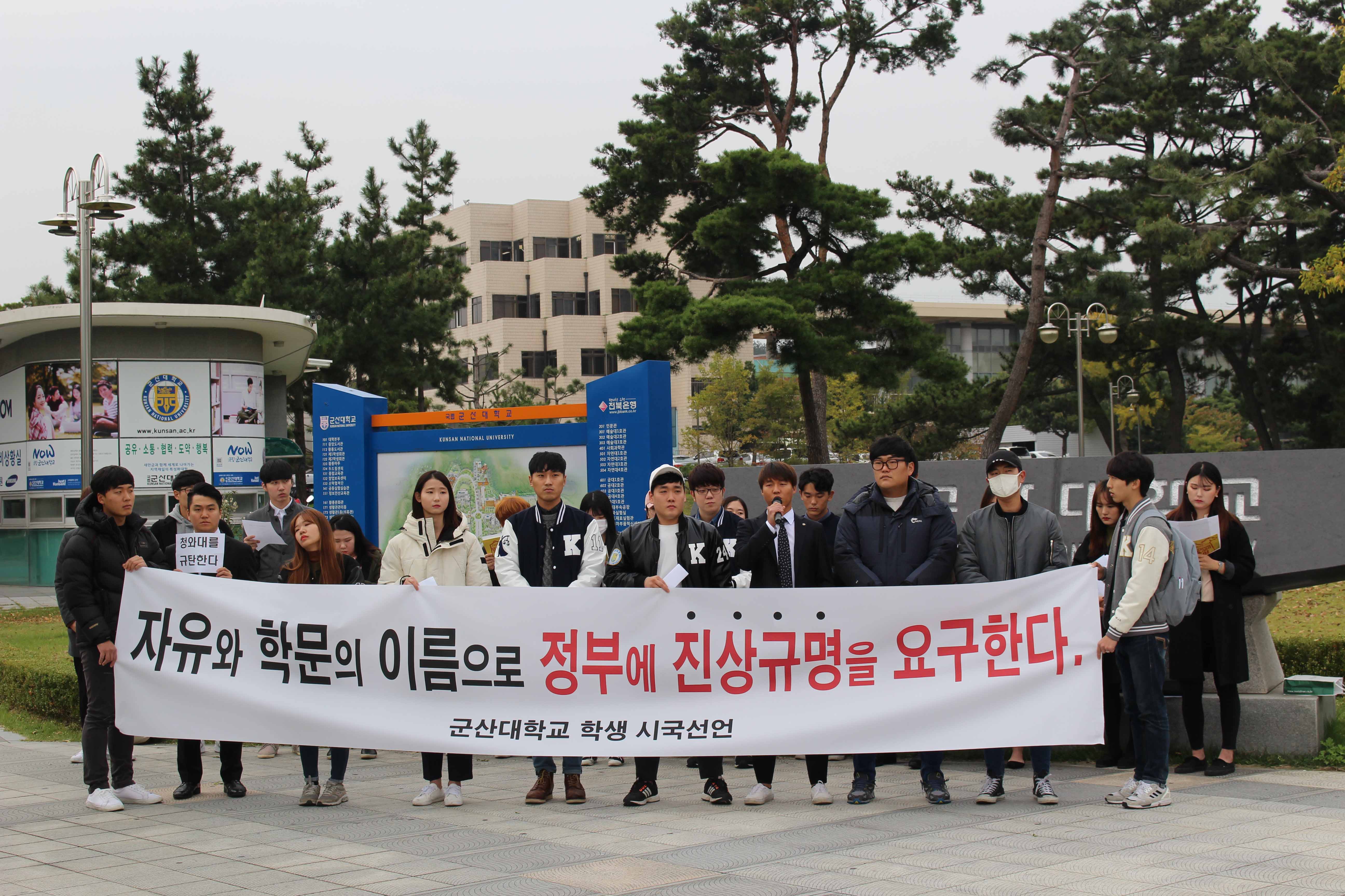 우리는 국립 군산대학교의 학생이자, 자유민주주의 공화국 대한민국의 국민으로써 미르재단, K스포츠, 정유라 특혜 의혹 등 이른바 ‘최순실 게이트’ 사건을 바라보며 잘못된 것이 당연한 게 되어버린 이 사회의 모순이 더 이상 대물림 되지 않도록 박근혜 정권에 촉구한다.