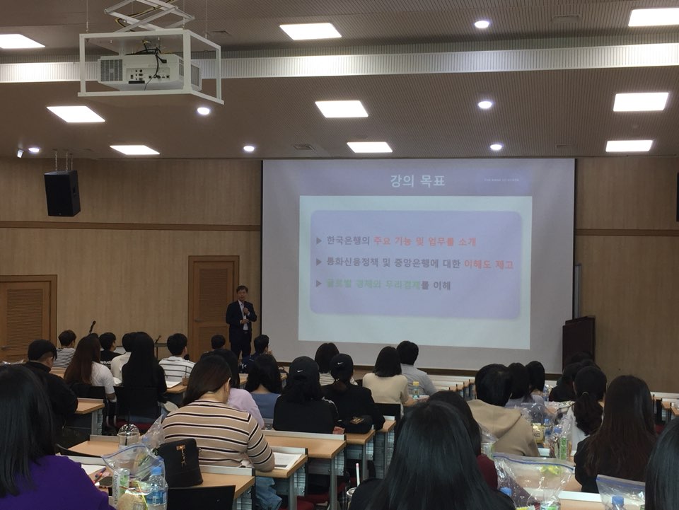 지난달 14일, 14시부터 우리 대학 종합교육관 2층 대강당에서 2019 금융아카데미가 개최됐다. 본 금융아카데미에는 경영학과 학우들뿐 아니라 교수진과 회계학과 교수도 참여해 강연장을 메꿨다. 본 강의는 주로 한국은행에 박창귀 부국장의 강연으로 이루어졌으며 한국은행에 대한 전반적인 기능과 역할에 대한 설명이 주로 이어졌다. 박창귀 부국장은 다양한 시청각자료는 물론 강의 중에 선물을 증정하여 청중의 참여도를 높였다.