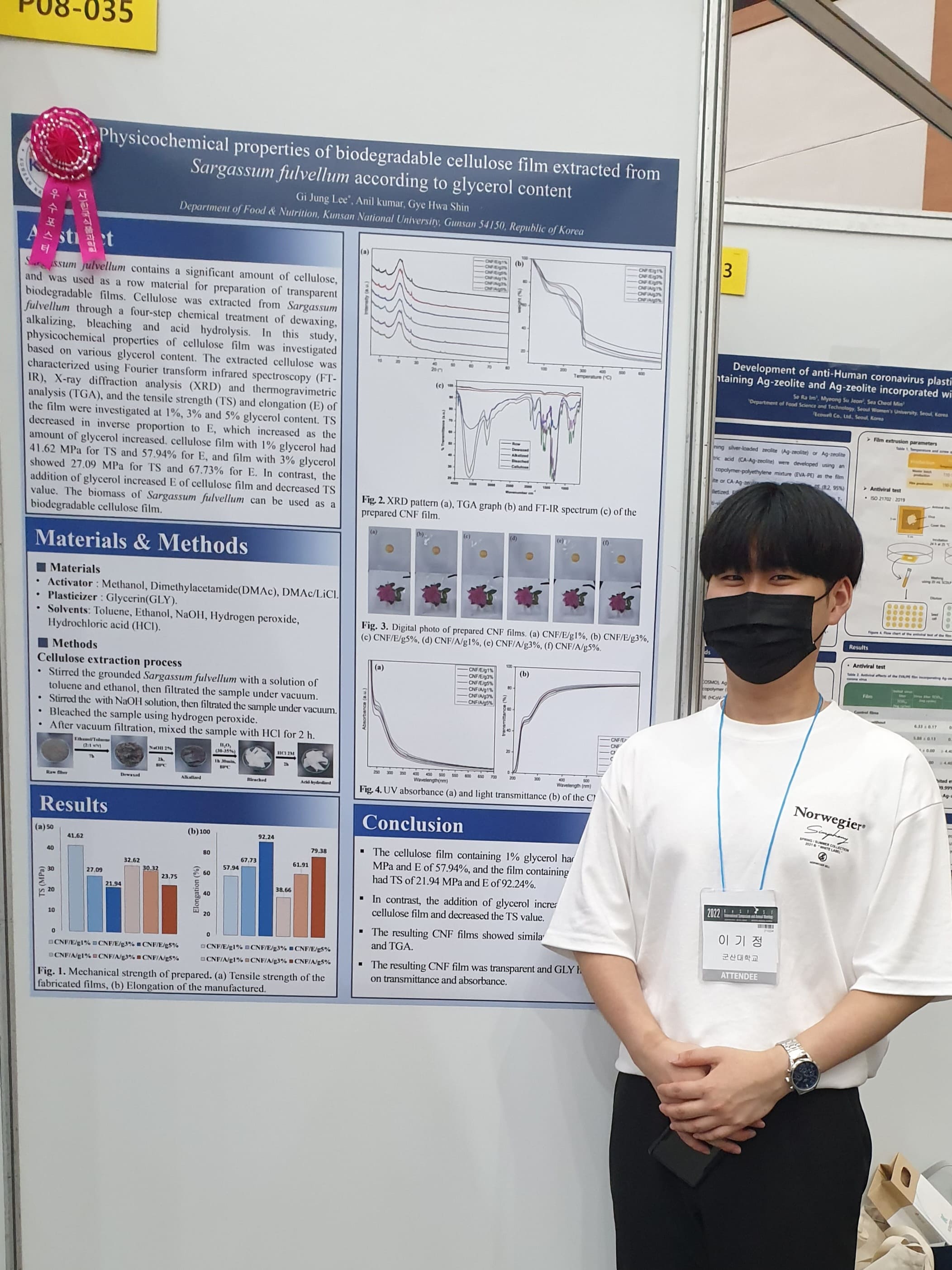 Q. 이번 학술대회의 연구 주제로 선정하신 ‘괭생이모자반에서 추출한 생분해성 셀룰로오스 필름의 물리화학적 특성’에 대해서 간단히 소개해주세요.