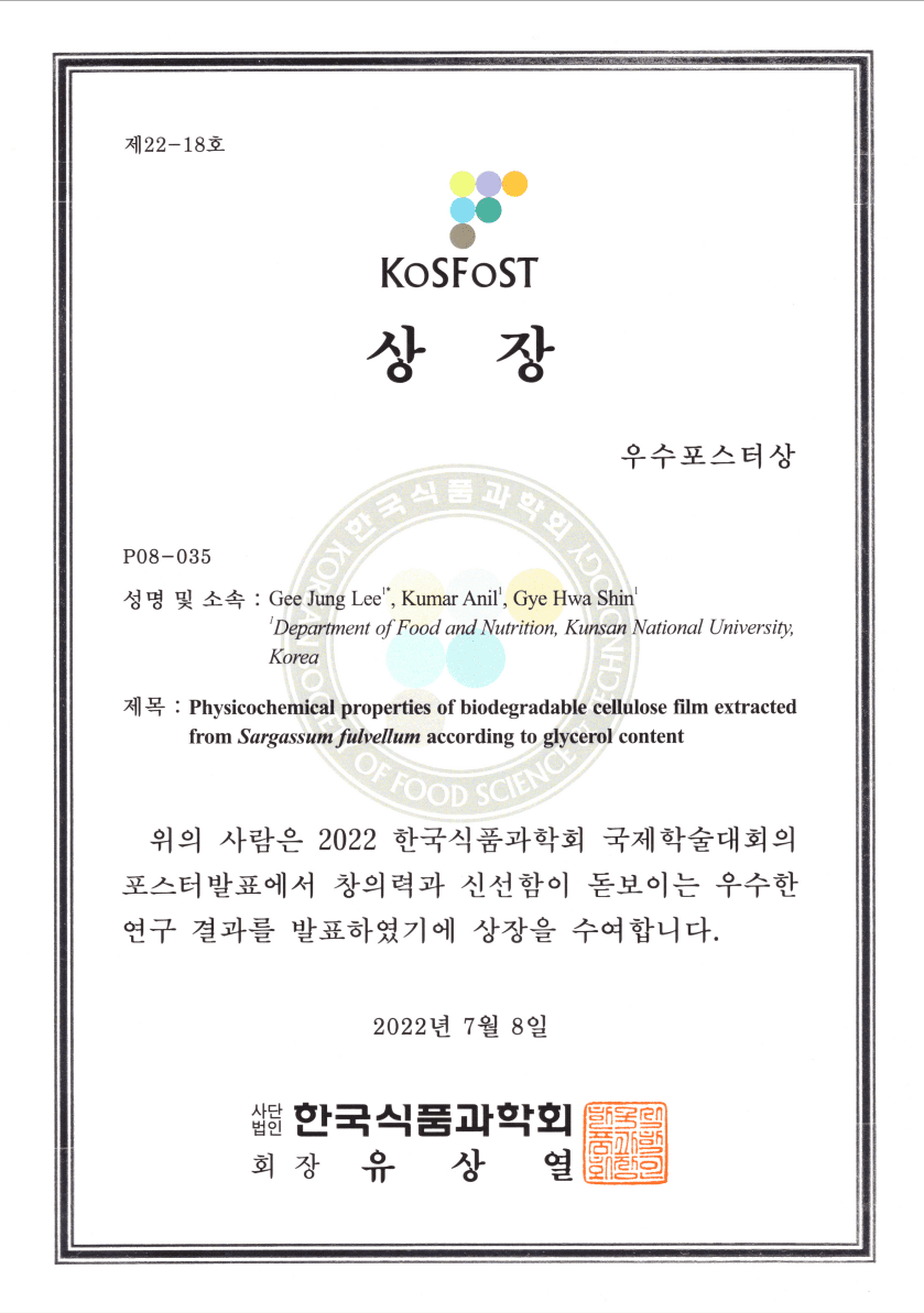 식품 분야는 떠오르는 미래산업 분야로 그 의미가 더욱 확장되고 있다. 식품은 더 이상 우리의 식탁에 오르는 음식만을 말하는 것이 아니며, 생산부터 포장까지 연결돼 향후 미래산업으로서 상호발전 될 가능성이 크다. 이에 관련 분야의 연구도 활발하게 이루어지고 있는데, 환경오염뿐만 아니라 어민들의 큰 골칫거리인 ‘괭생이모자반(여러해살이 해조류)’을 친환경 분해 소재로 개발하겠다는 멋진 창의력을 뽐낸 우리 대학 학우가 있다. 한국식품과학회 국제학술대회 우수 포스터상을 수상한 식품생명과학부 식품영양학전공의 이기정 학우를 만나보자.