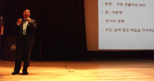| ▲ 영정적으로 강의 중인 채정룡 총장 사진 : 정현영 기자 | ||