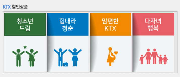 KTX offers ticket discounts. There is a ‘Youth Dream’ service that provides up to 30% discounts to 24-year-old youth and a ‘Cheer up Youth’ service that provides up to 40% discounts to young people aged 24 to 33.
