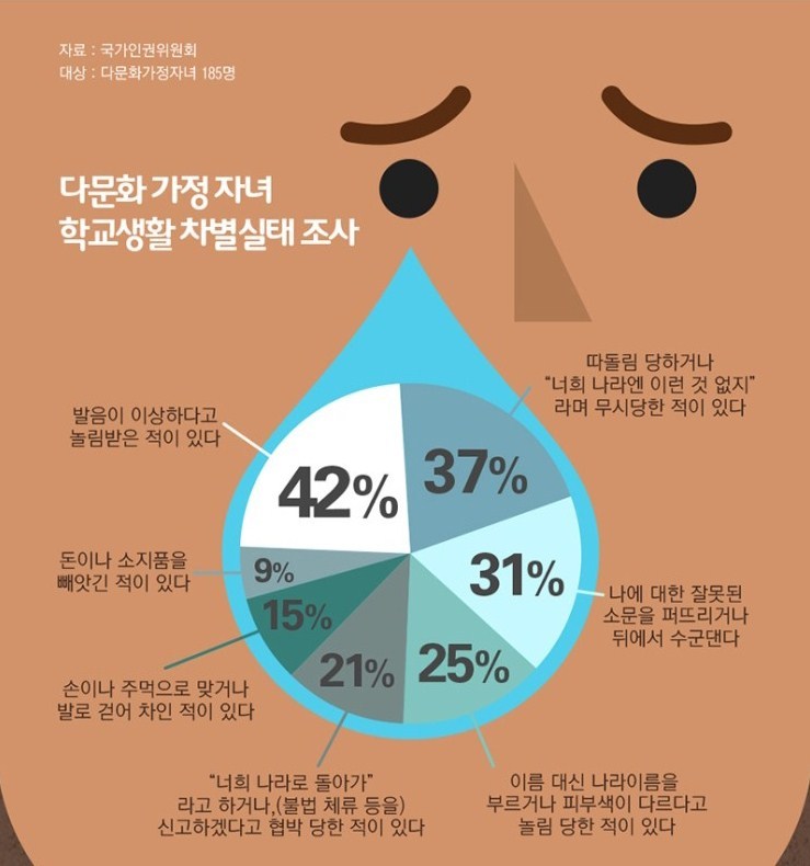 In fact, many multicultural children are being discriminated and ridiculed by Koreans. It is important for students to grow up in a bright and positive school environment because it greatly affects their formation of values. However, students from multicultural families often fail to continue their studies and drop out or adjust to school because of discrimination by native Koreans students. many of the children of multicultural families are said to have experienced ridicule and violence at school.