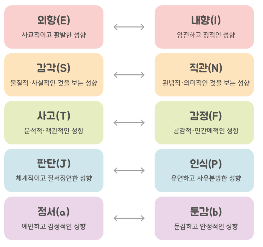 | ▲ MBTI 성향 지표 / 출처: MBTI & Health 심리 카페 |