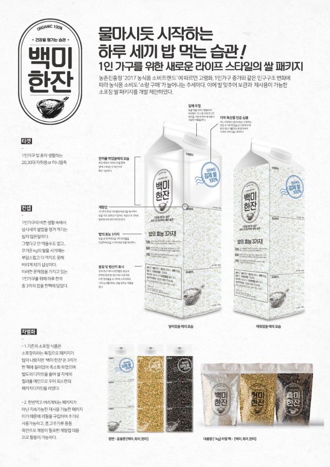 | ▲1인 가구를 위한 라이프 스타일의 쌀 패키지 디자인 / 출처 : 김민정 동문 |