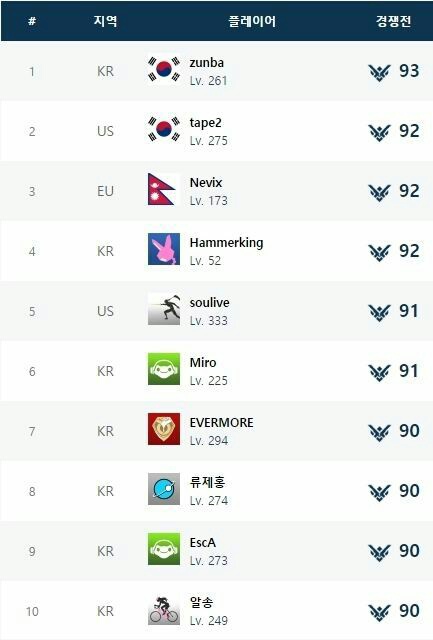 ▲ 오버워치 경쟁전 세계랭킹 표 / 출처 : 오버워치 공식 홈페이지