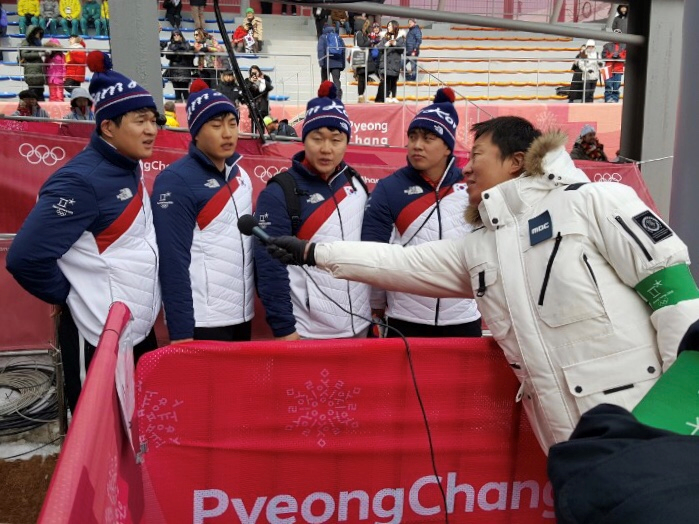 | ▲믹스드 존(Mixed Zone)에서 인터뷰 중인 대한민국 봅슬레이 남자 4인 팀의 모습 / 촬영 : 장세희 수습기자 |