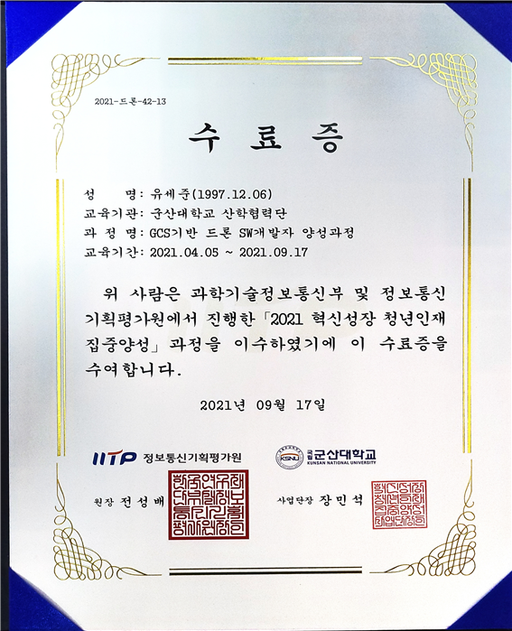| ▲ GCS기반 드론 SW개발자 양성과정 수료증 / 제공 : 유세준 동문 |