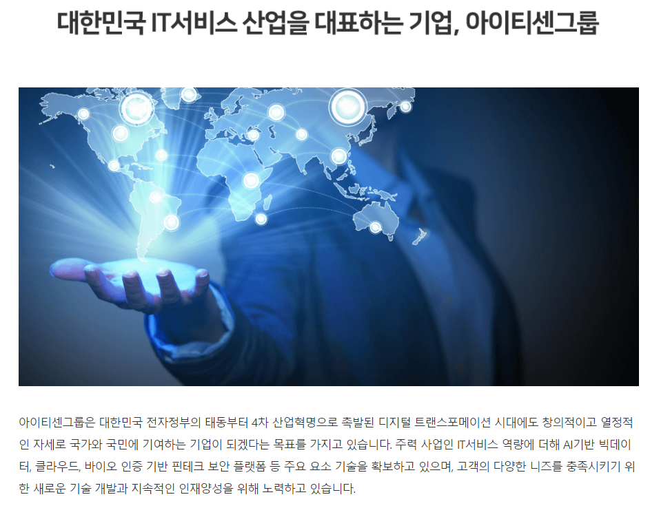 A. 아이티센그룹은 공공 시스템 통합(SI, system integration: HW, SW 자원통합을 통해 업무 효율을 극대화할 수 있는 통합 ICT 서비스 제공) 사업을 주력으로 하는 IT 서비스회사입니다. 또한, 쌍용정보통신, 콤텍시스템, 콤텍정보통신과 같은 IT 서비스기업을 인수·합병하여 공공사업을 넘어 금융, 제조, 의료, 건설 등의 분야에서 SI, 네트워크 통합(NI, network integration), 보안, 유통에 이르는 비즈니스 영역 범위를 확대하고 있습니다.