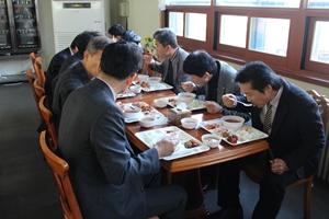 <오후 12시> 2시간여의 회의를 마치고 위원들과 함께 점심을 같이 하였다. 식사는 제1학생회관 교직원식당에서 하였는데 총장이 평소 교내식당을 이용하는지 총장의 비서에게 질문하자 비서는 때때로 이용하여 교수들과 이야기를 나눈다고 답하였다.