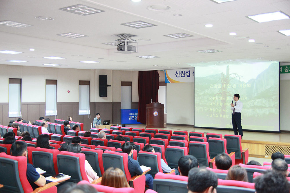 본격적으로 강연이 시작되기 전, 나의 균 총장은 “산은 편안함을 주는 공간이다. 군산에 재선충이 들어와 많은 어려움을 겪고 있다. 이에 군산대에 수목원을 설치 해 지역과 같이 가는 군산대를 만들도록 노력하겠다. 이와 관련해 산림을 총괄하 고 있는 산림청의 도움을 받았으면 좋겠 다고 여겨 (신원섭 산림청장을)모시게 됐 다. 고맙다.”며 환영의 인사를 했다.