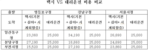 한편 수도권 주요 지역 택시비와 대리운전 비용을 비교해본 결과, 기본료가 오르고 택시요금 할증제가 확대될 경우 상당수 지역에서 대리운전을 이용한 이동비용이 택시비보다 저렴한 것으로 나타났다. 택시가 시속 15㎞ 미만으로 운행할 때 거리에 시간 요금이 병산돼 계산되는 점을 감안, 지속적으로 시속 15㎞ 이상으로 운행한다고 가정했다. 현재 택시요금은 기본 2400원(서울 기준)으로 2㎞를 운행하고 이후 144m당 100원이 추가된다. 심야할증은 기본 요금에 20% 가산된다. 시계외 할증은 서울시 경계선을 넘어가는 순간부터 20% 요율이 적용될 예정이므로 장거리는 대리운전이용이 효율적이다.