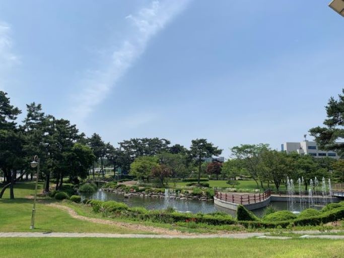 세 번째로 소개할 곳은 국제교류교육원 옆 분수대 및 인공호수 정원이다. 이곳은 다양한 꽃, 나무들과 더불어, 인공호수가 잘 어우러진 아름다운 조경으로 우리 대학의 ‘정원’이라 칭해진다. 정원 안 산책로 곳곳에는 벤치가 설치되어 있어 잠깐의 휴식을 취하거나, 독서하며 여유를 즐기기에 적합하다. 또한, 인공호수 위를 지날 수 있는 간이 다리가 있어 인공호수를 더욱 잘 구경할 수 있고, 분수대에서는 물이 뿜어져 나와 시원한 느낌을 받을 수 있다. 참고로 정원은 정문부터 황룡도서관까지 길이 연결되어 있어 상쾌한 등굣길로, 혹은 하루의 끝을 마무리하는 하굣길로 이용해도 좋다.