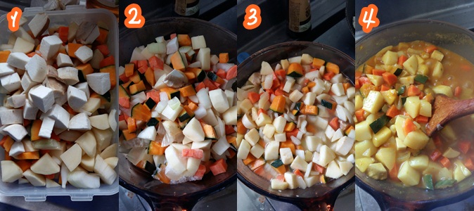 Ingredient: Various vegetable( carrot, onion, mushroom, sweet pumpkin so on), a bag of curry powder, oil( olive oil, grape seed oil so on), apple