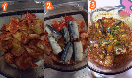 1. Add Kimchi, Pacific saury Packed in cans, used water from washing rice, soy souce , prepared marinade and boil this ingredient