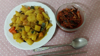 < Pacific saury and ripened kimchi steamed dish >